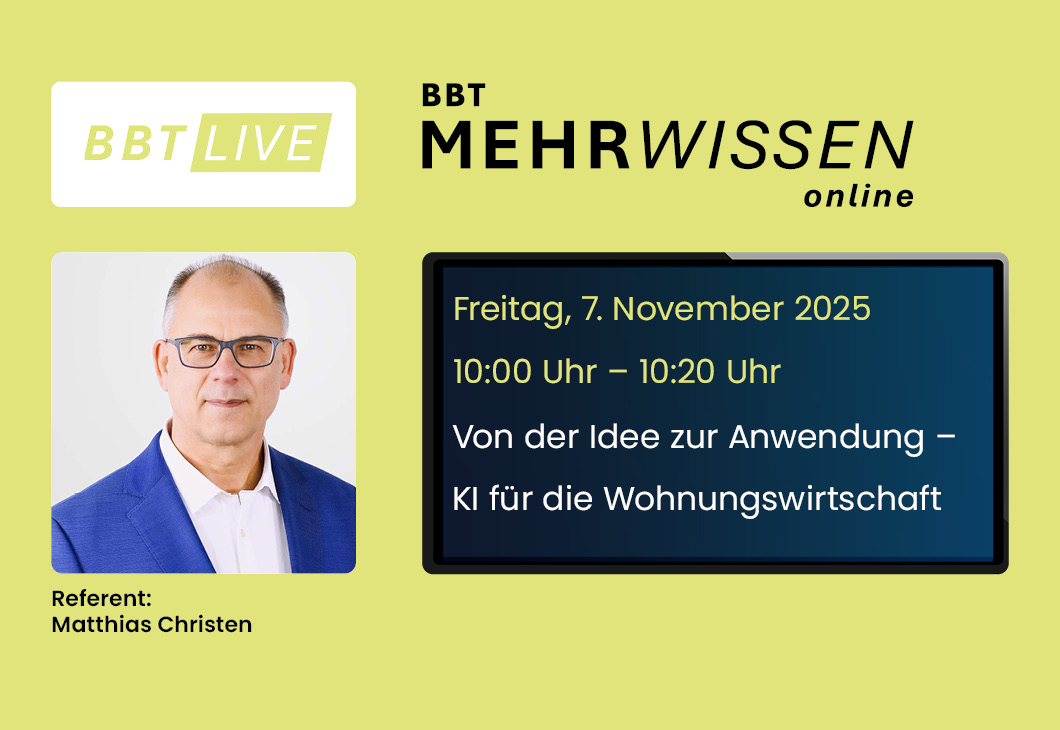 Ihr BBT-Newsletter immer hier mit den neuesten Beiträgen — bleiben Sie informiert über relevante Entwicklungen, Fachwissen und Neuigkeiten aus der Wohnungswirtschaft.