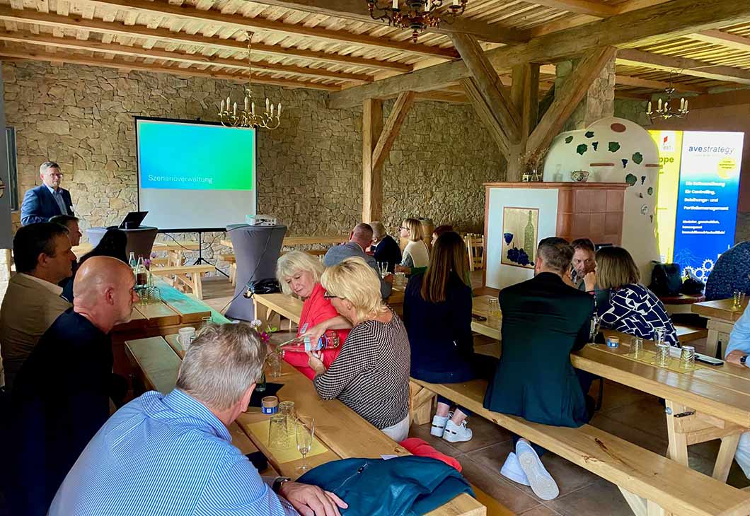 In der exklusiven Atmosphäre der historischen Weinscheune hatten die Teilnehmenden Gelegenheit, sich anhand praxisnaher Erfahrungsberichte über den Einsatz von avestrategy, die Begleitung beim Wechsel des ERP-Systems sowie über die Herausforderungen der digitalen Transformation zu informieren.